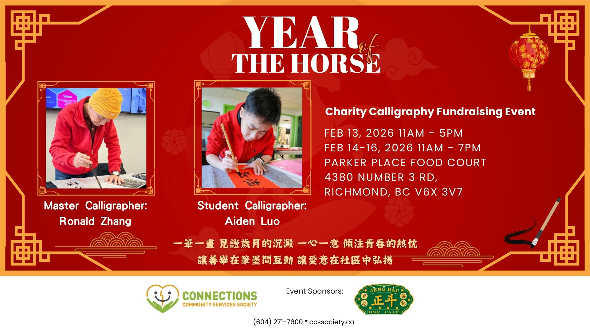 Connections Community Services Society (CCSS) will host a Lunar New Year Charity Calligraphy Fundraising Event at Parker Place, featuring live Chinese calligraphy by Master Calligrapher Ronald Zhang (張士方) and student calligrapher Aiden Luo (羅栩烽). Visitors can receive custom-written Chinese New Year banners (Fai Chun) by donation, created on-site by Master Calligrapher Ronald Zhang and student… Read More »Year of the Horse – Chinese Calligraphy Fai Chun Fundraiser |
